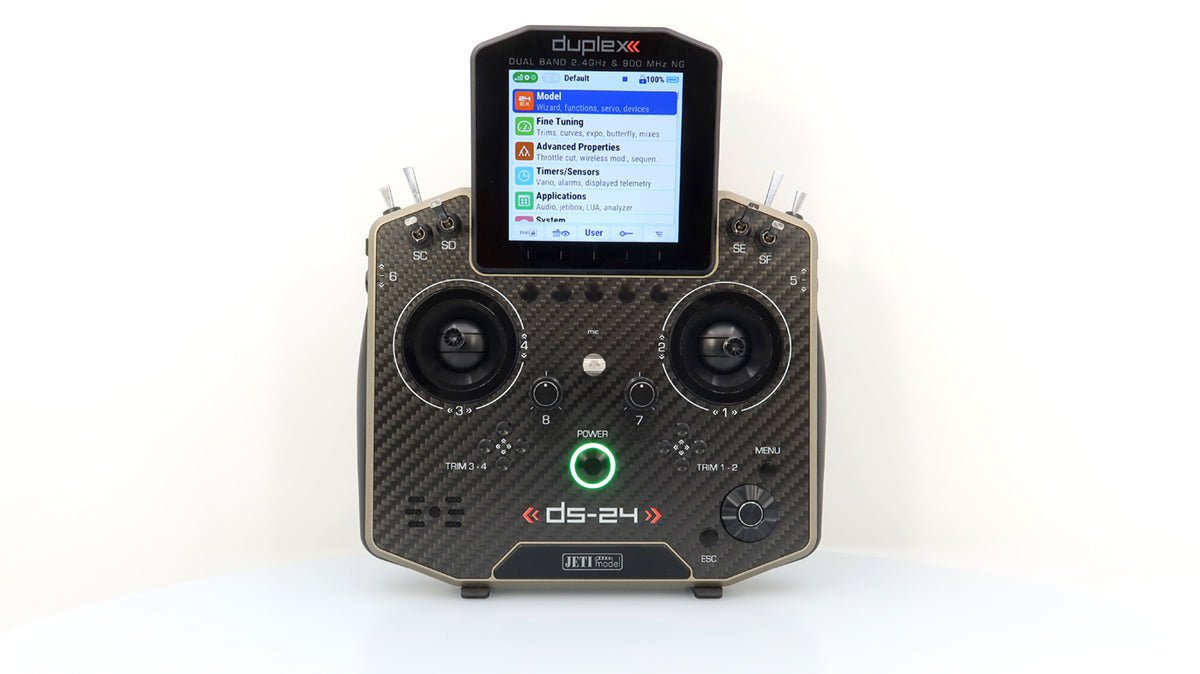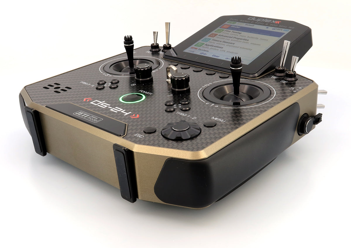 The second generation of the DS-24II transmitter series features a timeless design with a redesigned and lighter frame for enhanced comfort. It now supports Bluetooth connectivity with smartphones and includes new stick controls with front side adjustments.